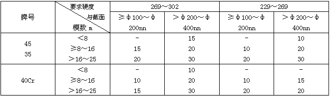 6.2.4當所選材料的齒輪毛坯工藝硬度達不到圖樣标準注的硬度加要求的硬度差值時,應進行預先切齒再調質。常用的調質齒輪鋼材料 截面硬度對應關系見附錄A(參考件)。