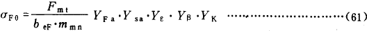 齒根應力基本值σF0是以載荷作用於齒頂爲計算基礎,然後利用重合度系數Yε,将齒頂加載時名義齒根應力轉換爲單對齒齧合區上界點加載時的值 ,再考慮螺旋角的影響及錐齒輪特點後得出的。由下式確定:
