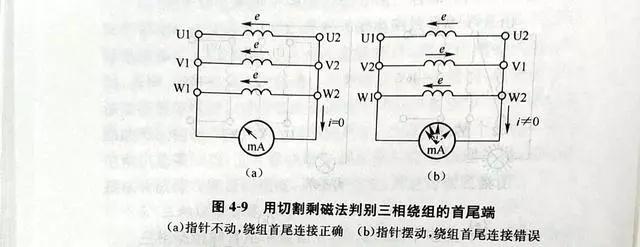 切割剩磁法是利用轉子鐵心中的剩磁在定子三相繞組中感應出電動勢,用萬用表指示出其回路中的電流值來檢查的。接線如圖4-9所示,用萬用表(毫安擋)進行測量。測量時用手轉動電動機的轉子,如果萬用表的指針不動,則說明三相繞組首尾連接是正確(què)的。即三相繞組的首端與首端連接 、尾端與尾端連接。如果萬用表的指針來回擺(bǎi)動,則說明三相繞組連接有誤,應改接後重試。