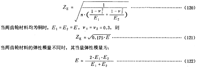 彈性系數ZE是用以考慮材料彈性模量E泊桑比v對赫茲應力的影響 。其數值可按實際的材料彈性模量E和泊桑比v由式(120)計算得出。對於某些常用材料組合的ZE可參考表14查取 。