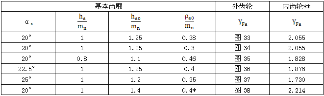 與圖33至38各齒形參數相對應的内齒輪齒形系數YFa也可由表19查取 。