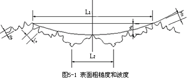 加工表面的微觀幾何特征主要包括表面粗糙度和表面波度兩部分組成,如圖 5— 1所示。表面粗糙度是波距 L小於(yú) 1mm的表面微小波紋;表面波度是指波距 L在 1~ 20mm之間的表面波紋 。通常情況下,當(dāng) L/H(波距 /波高)﹤ 50時爲表面粗糙度, L/H=50~ 1000時爲表面波度。