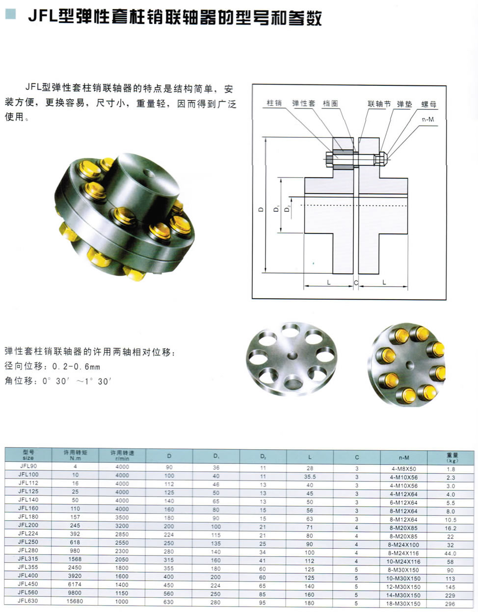 JFL型彈性套柱銷聯軸器的特點是結構簡單,安裝方便 ,更換容易,尺寸小,重量輕,因而得到廣泛使用。