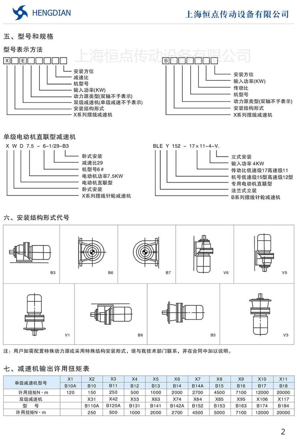 X/B擺線針輪減速機型号表示方式,安裝結構形式代号,擺線針輪減速機輸出許用扭矩表.