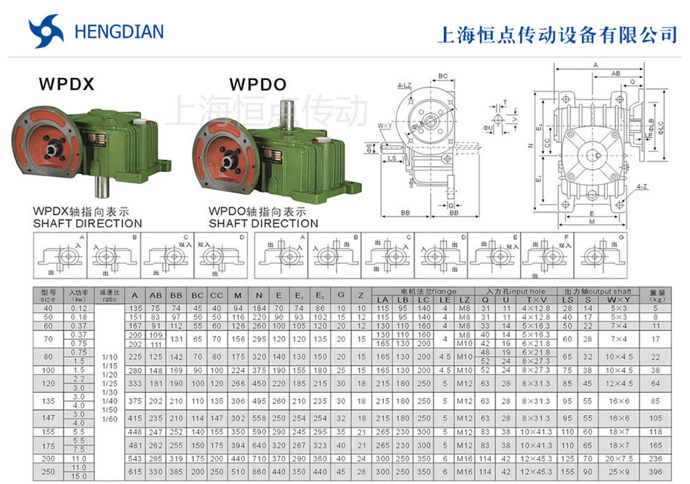 WPDO與WPDX減速機的外形尺寸及安裝尺寸,WPDO與WPDX減速機法蘭輸入,軸輸出.WPDO與WPDX減速機軸指向表示方法.機座号從40到250,可選速比從10到60.WPDO與WPDX系列蝸輪蝸杆減速機選型指南